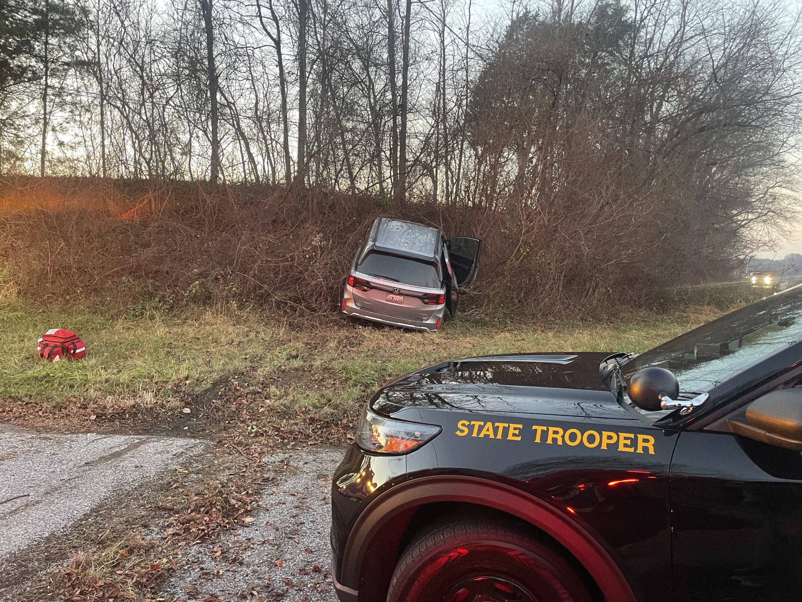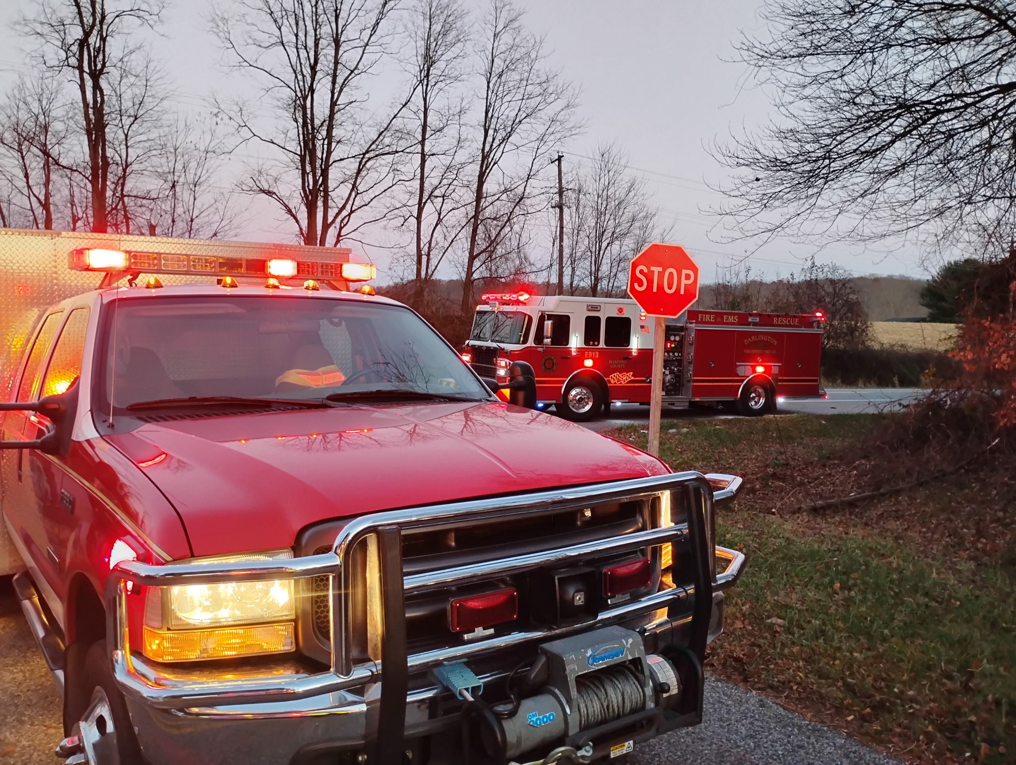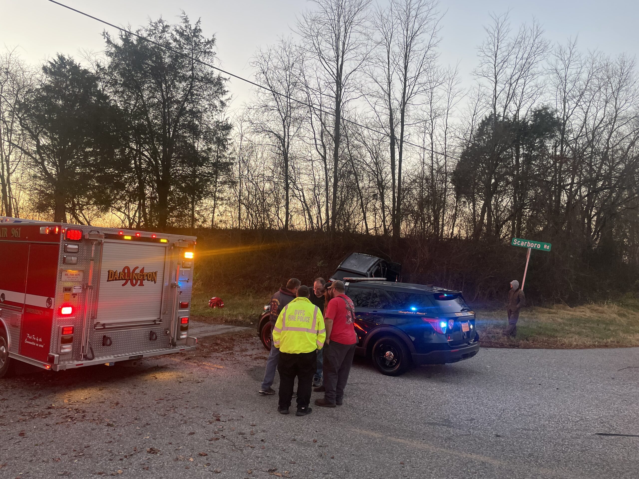 On Sunday, November 23, Engine 913, Air 9, Medic 92 and Maryland State Police responded to a single vehicle collision at Rt 136 and Scarboro Rd. Medic 92 arrived to find a single vehicle off the roadway.  Medic 92 assisted the occupants from the vehicle; no extrication was required. The vehicle was determined to be safe (not leaking fluids, not a fire risk, no wires down etc) and the scene was left to Maryland State Police to investigate the collision and await a tow for the vehicle. DVFC units were on scene approximately 20 minutes.